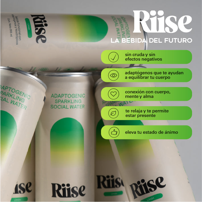 Riise es una bebida funcional sin azúcar ni cafeína, hecha con adaptógenos y nootrópicos. Relaja, eleva tu estado de ánimo y te ayuda a sentirte presente y en paz.